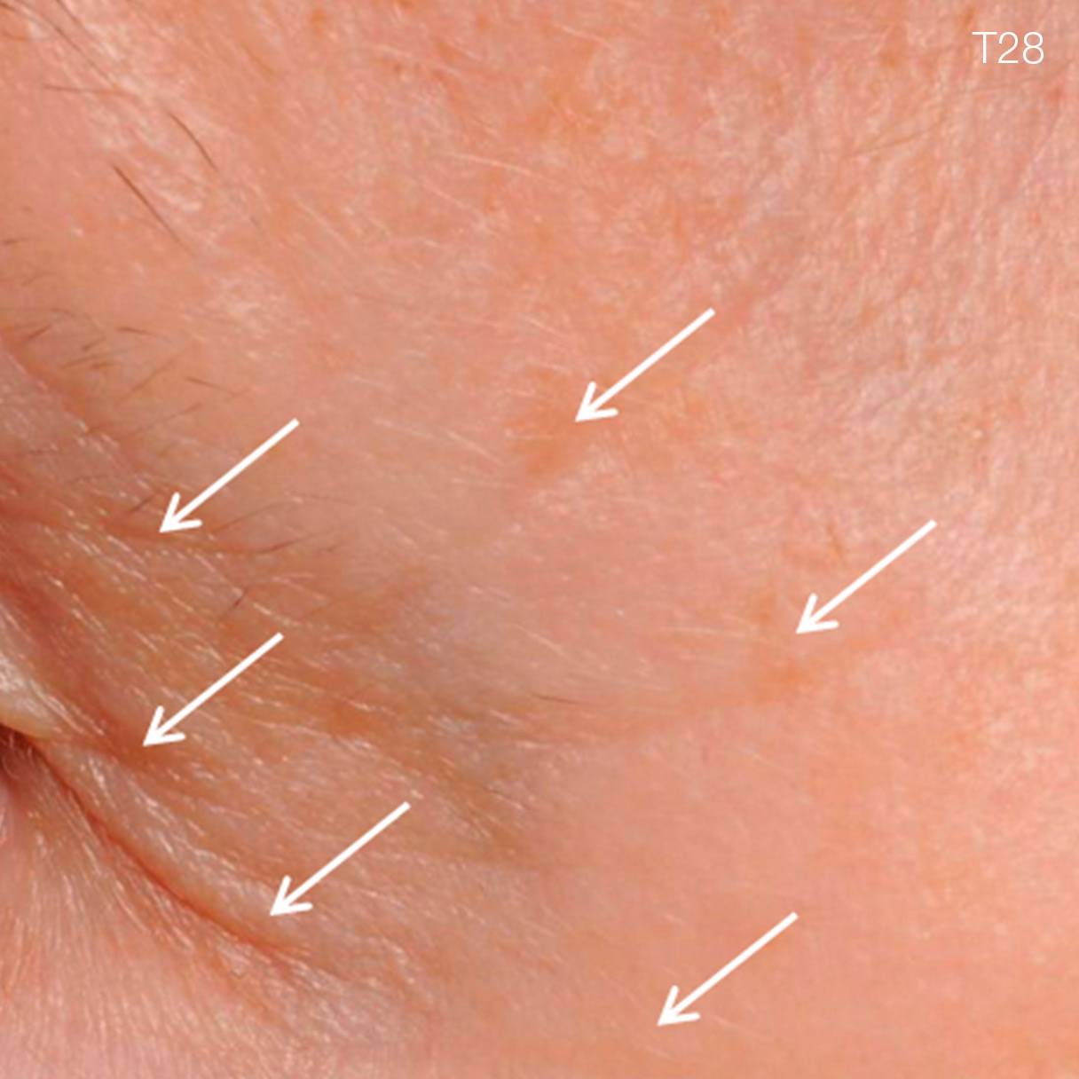 Resulting from the completely new culture in a photobioreactor of the calcified algae Jania rubens; Actiporine 8G detoxifies fibroblasts and reactivates collagen synthesis to redensify the dermis and reduce crow's feet wrinkles in 2 weeks.